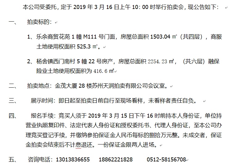 乐余商贸花苑1幢111号门面、杨舍镇西门南村5幢22号房产拍卖公告